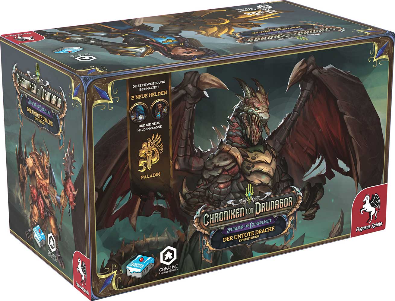 Die Erweiterung Chroniken von Drunagor: Der untote Drache bringt die gigantische Miniatur des untoten Drachen Aral Hezec und die Paladine Jade und Drasek, um sich ihm entgegenzustellen. Außerdem erhalten die Spielenden den neuen Gegnertyp Verdorbener Bauer, 3 Truhen, 8 neue Türen, sowie 16 Geländepläne. Das Abenteuerbuch führt in mehr als 10 Spielstunden durch einen epischen Kampf gegen die Dunkelheit.