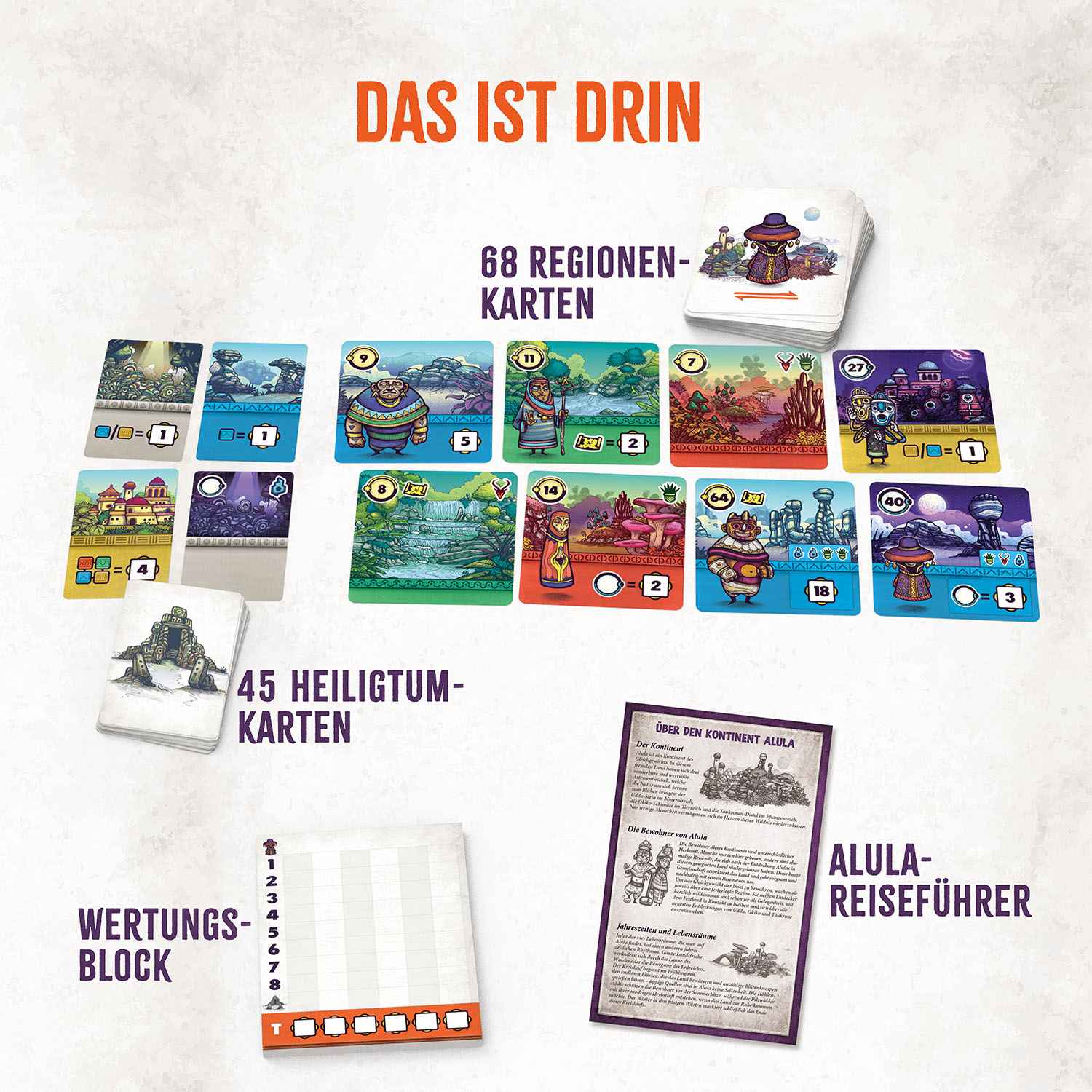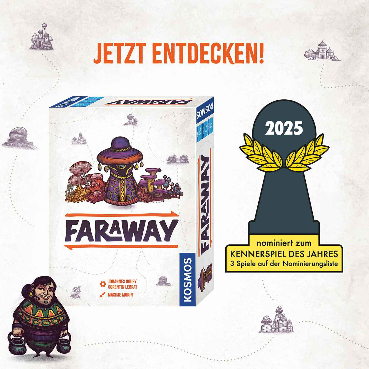 In Faraway erkunden bis zu sechs Spielerinnen und Spieler ab zehn Jahren den sich ständig verändernden Kontinent Alua. Das Besondere: Die Karten werden in acht Runden von links nach rechts ausgelegt, während die Bewohner spannende Aufgaben stellen, die am Ende Ruhmespunkte einbringen. Das Besondere: Die Wertung erfolgt in umgekehrter Reihenfolge – von rechts nach links! Nur eine geschickte Strategie auf der Reise durch Alua wird zum Sieg verhelfen. Origineller und schneller Spielspaß zu zweit oder in der Gruppe.